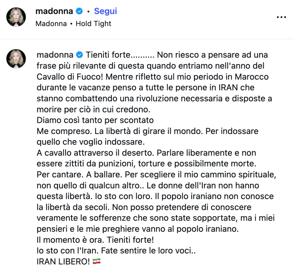Madonna torna a far sentire la sua voce su uno dei temi più delicati della scena internazionale: le proteste in Iran e la repressione esercitata dal regime di Teheran. Lo fa attraverso un lungo messaggio pubblicato su Instagram, dove la popstar americana intreccia un racconto personale a una presa di posizione politica chiara, ribadendo il suo sostegno a chi, nel Paese mediorientale, continua a manifestare chiedendo diritti e libertà fondamentali.
